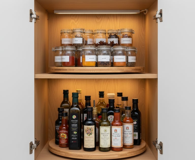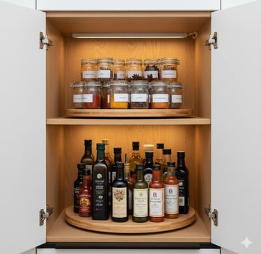 Spice carousels or small turntables reduce forgotten bottles in the back.
