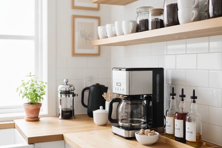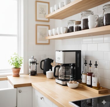 Visual Idea: Cooking zone with pots and oils near stove; baking zone with mixing bowls and baking sheets; coffee/tea station with mugs, sugar, and coffee maker.
